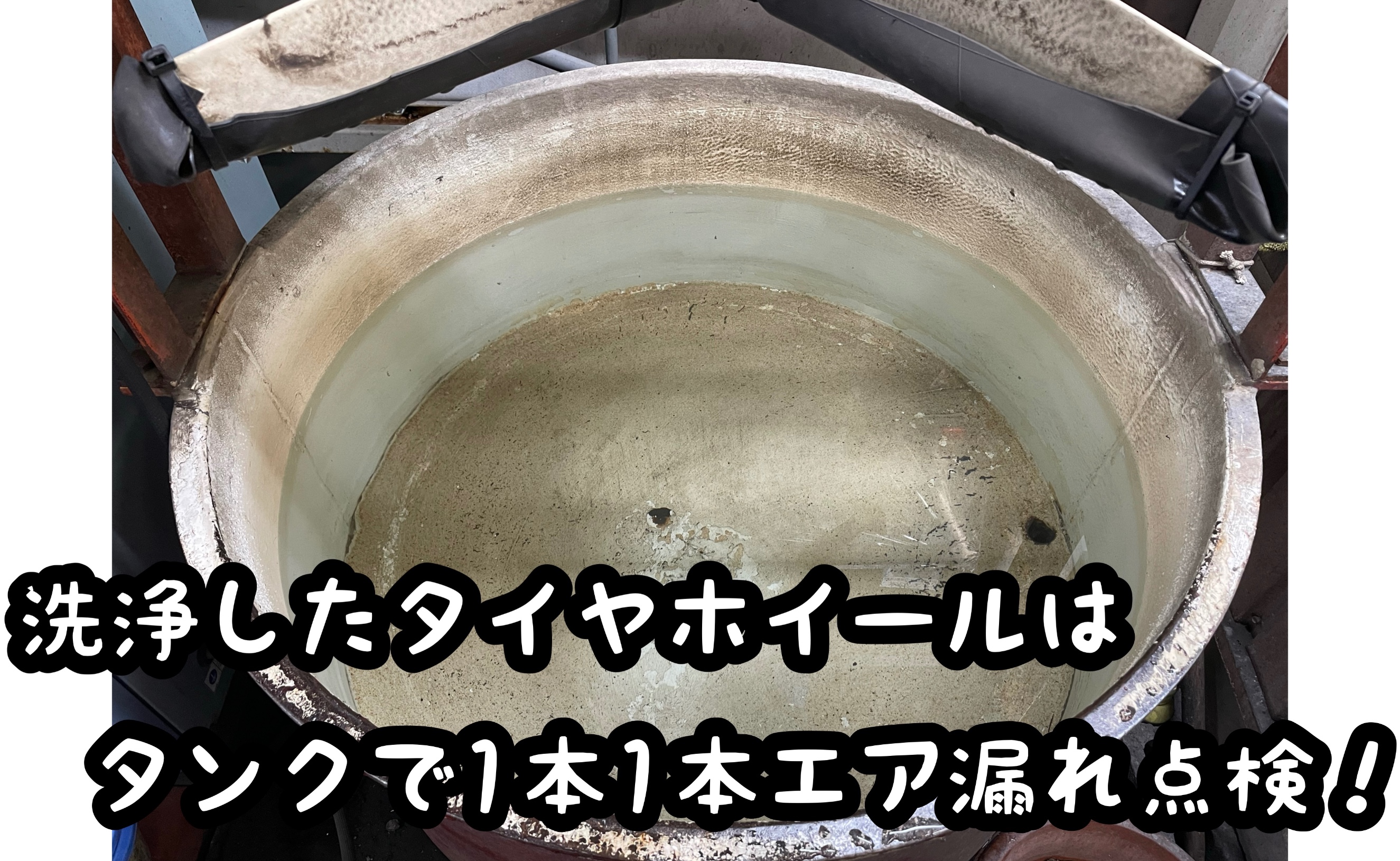 タイヤ交換時にホイールの汚れを除去して組み付けますがそれでも稀にスピュー(タイヤ製造上出るヒゲみたいなゴム)が挟まったり、ホイールの腐食などでビード部からジワーッとエア漏れがする場合があるので当店ではタイヤ交換したホイールは全てこのタンクに付けて面裏どちらもビードからエア漏れが無いことを点検します!