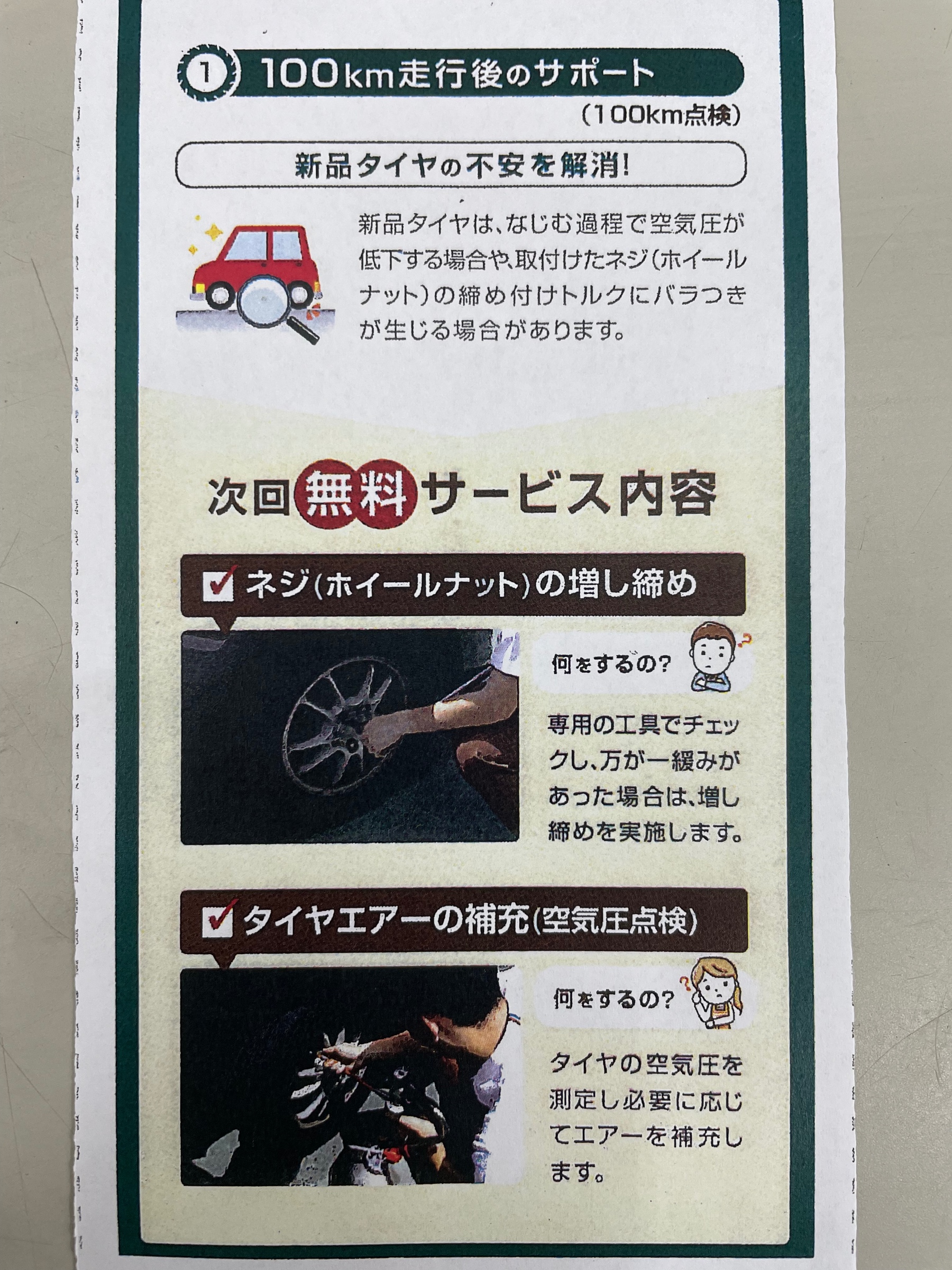 勿論タイヤ交換後のサービスも充実!先ずは100キロ点検!
