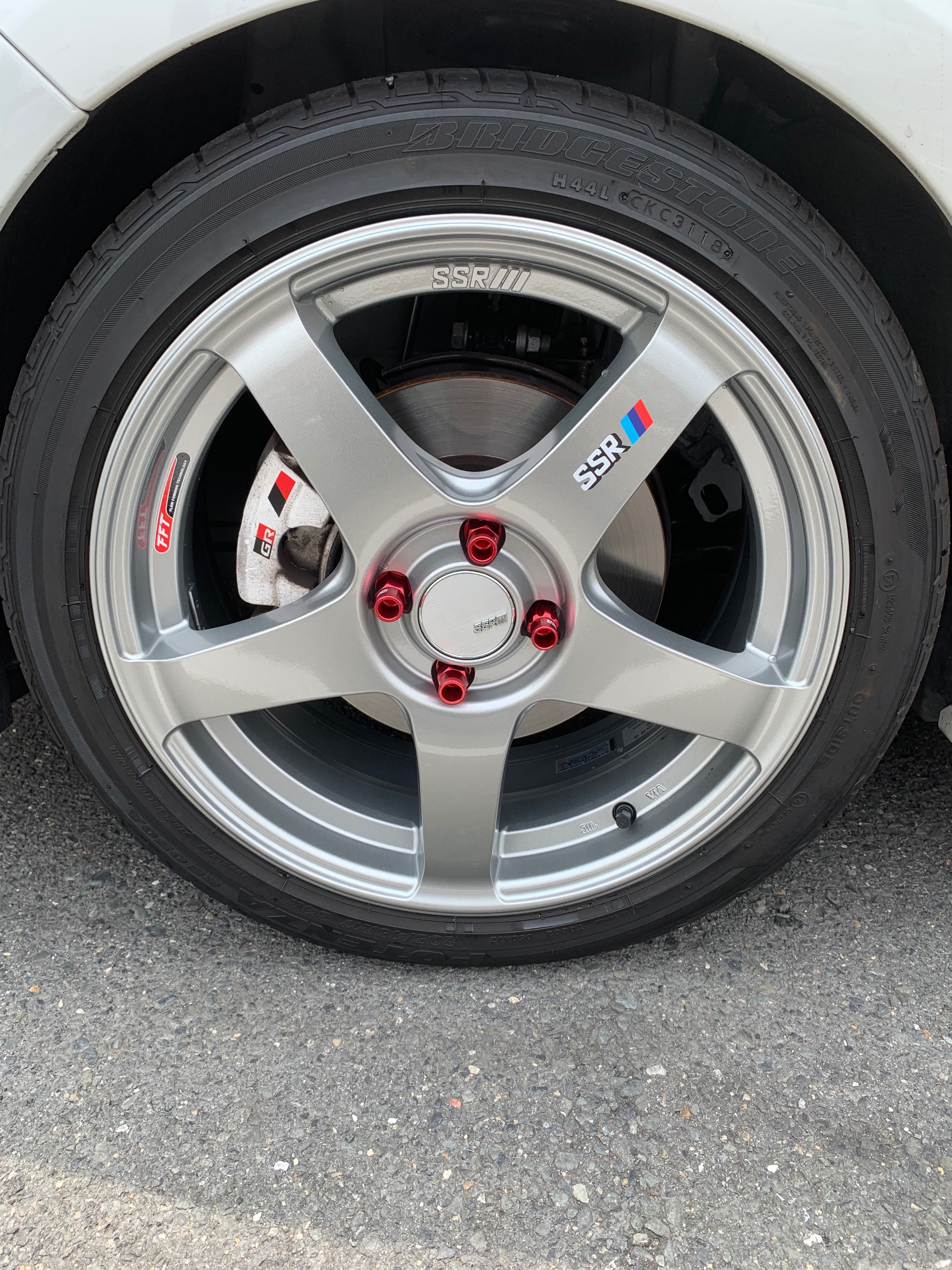 乗り心地も考えて今回は17インチのままでいきますが、リヤを少しだけ出したいのでオフセットを少し変更する事に(^^)ついでにリヤトランスポートフックも同時取り付け(`・ω・´)キリッナットはSSRの軽量ナットセットでお取り付け