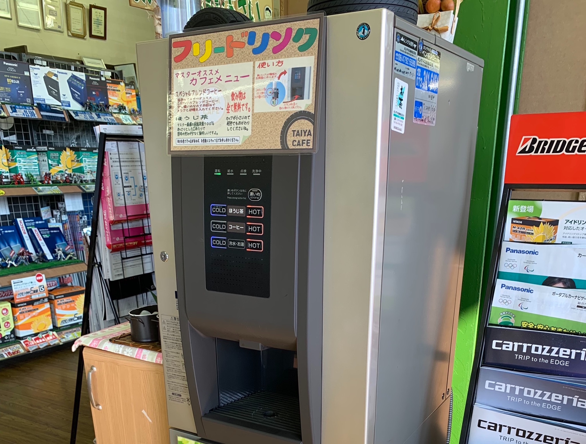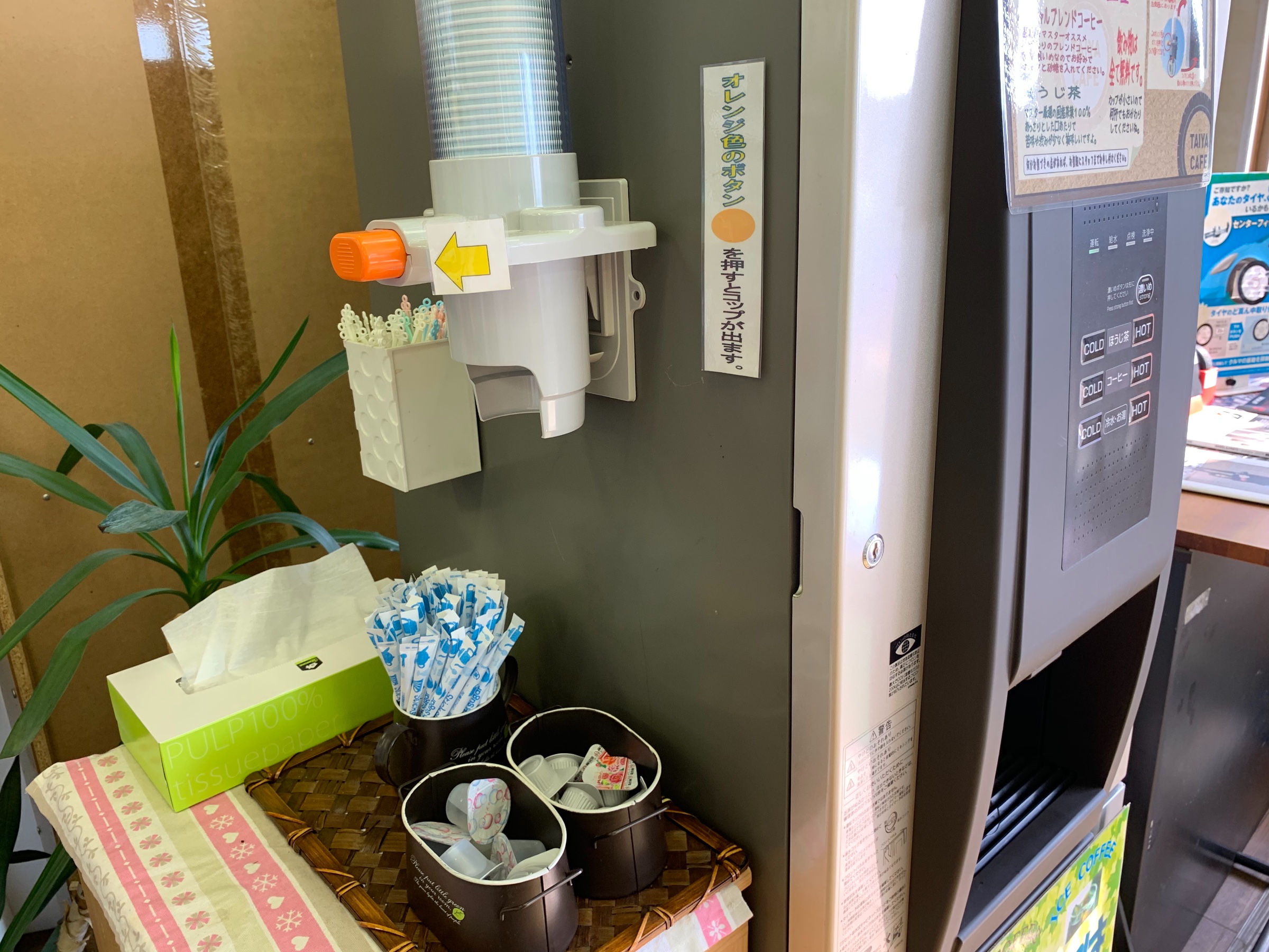 そこでタイヤ館では熱中症対策として店内では冷たいフリードリンク(お茶、お水、コーヒー)と塩飴を各テーブルにスタンバイしてます(`・ω・´)キリッ横のオレンジのボタンをピッ♪と押しますとカップが出ます( ´ ▽ ` )※電子音は鳴りません