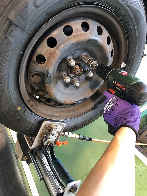 静止画なので分かりにくいですが、タイヤを車に装着する際に特殊な道具で