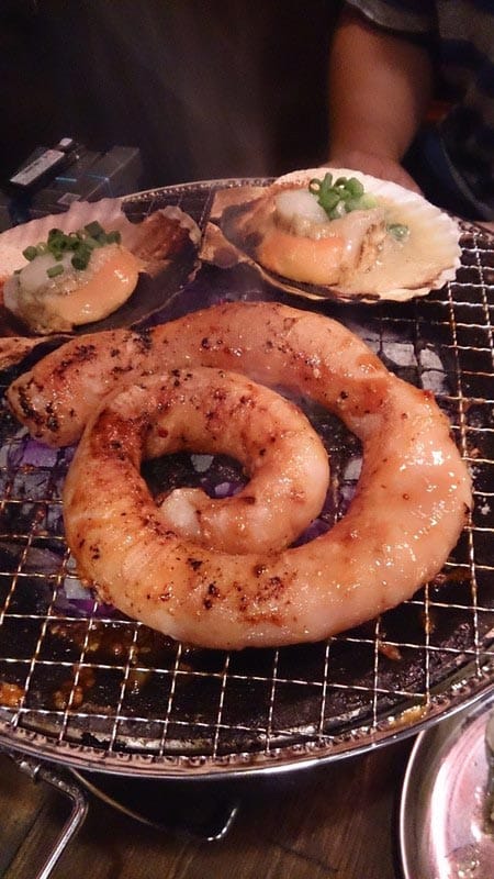 スーパーマルチョウとホタテを炭火焼きでいただきました。