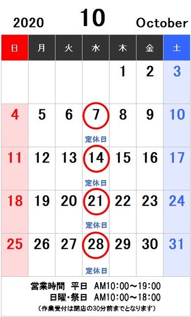 10月の定休日のお知らせ ポスト 2020年10月1日 10月のお休みは 7日(水) 14日(水) 21日(水) 28日(水) です。 営業時間は 平日 10:00~19:00 (受け付けは閉店30分前18:30まで) 日・祝 10:00~18:00(受け付けは閉店30分前17:30まで) 10月もお客様のご来店をスタッフ一同お待ちしております。 カテゴリ:お知らせ