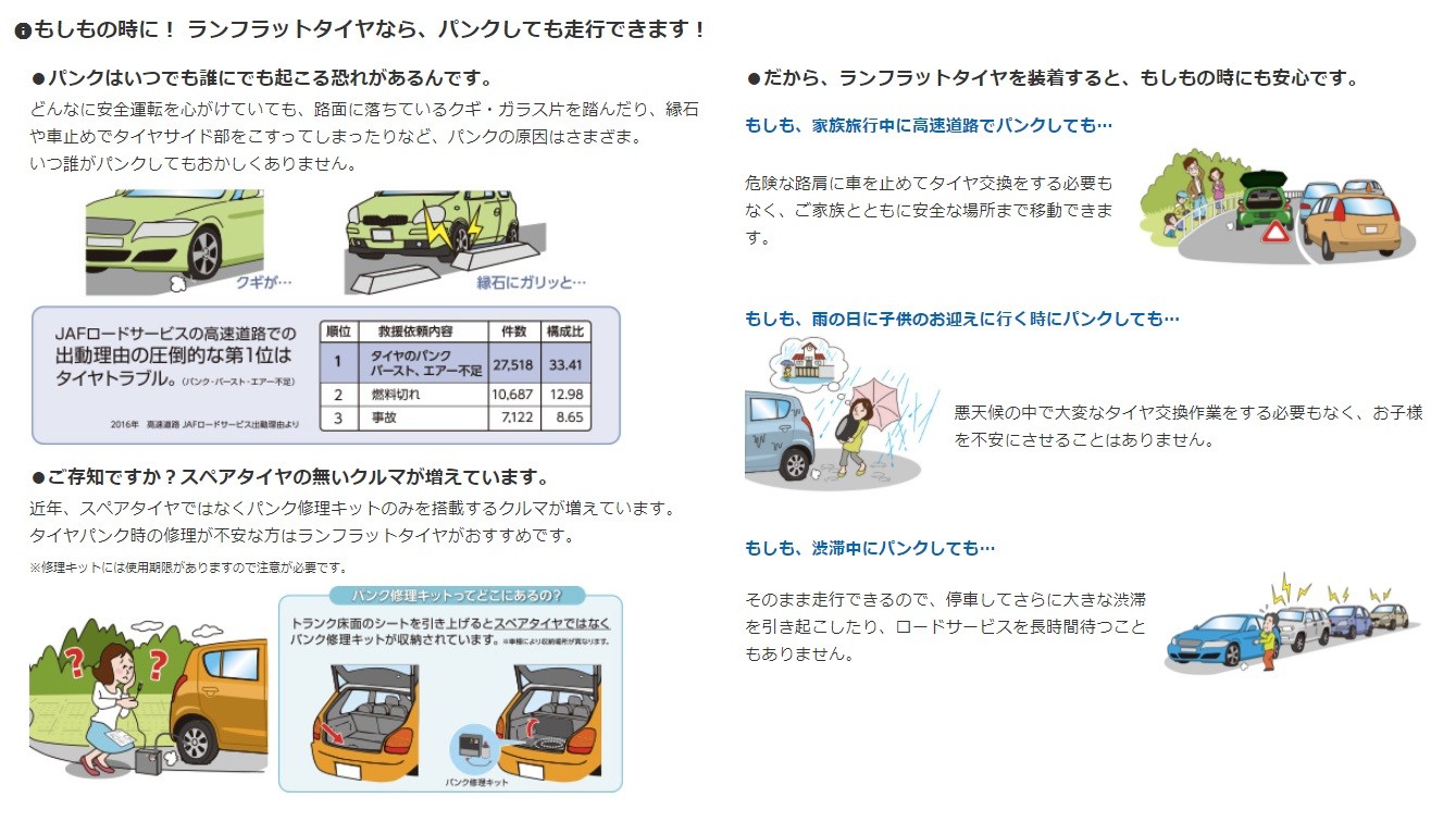すでに多くの方がご存じだと思いますが「ランフラットタイヤ」はパンクしても一定の距離を所定スピードで走行できるタイヤのことです。