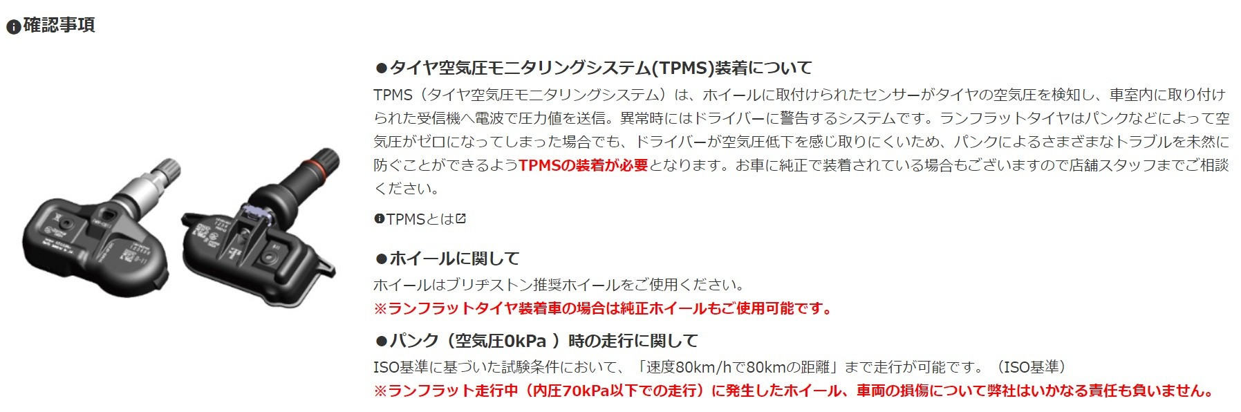 また、ランフラットタイヤはサイド部分が非常に硬くできており、パンクしたり空気圧が大きく低下しても外見からはそれに気が付かないことが多くあるため、こちらの商品も同時に購入する必要があります。