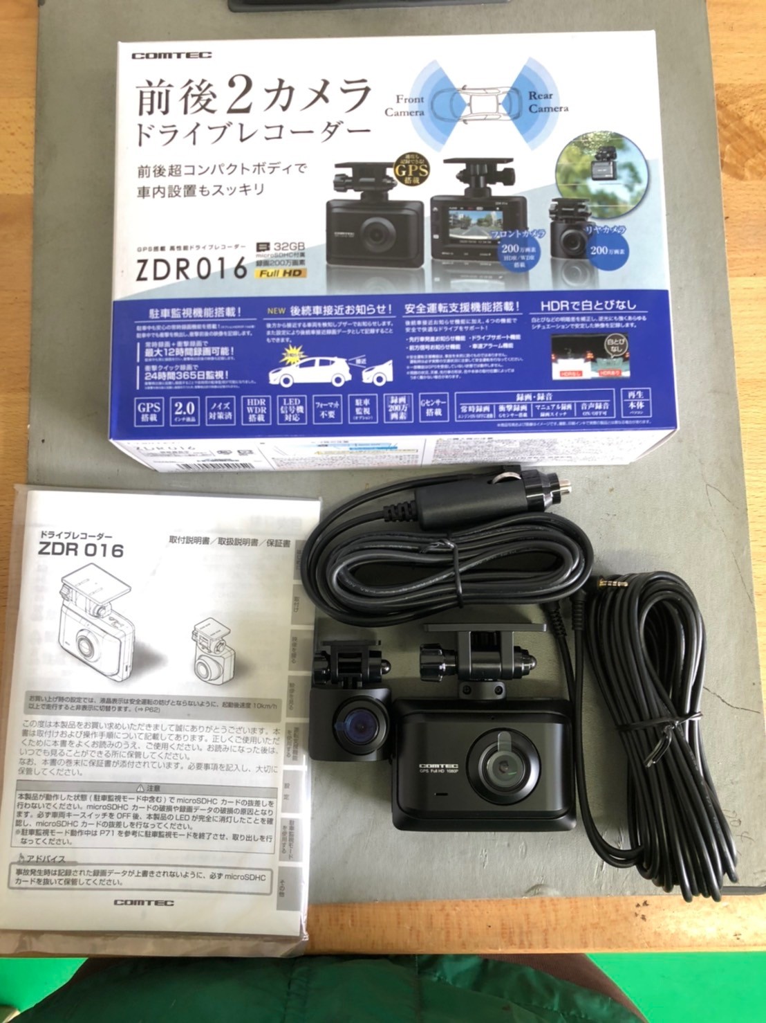 今回取り付けしますのは、前後2カメラタイプの「コムテック ZDR016」です。
