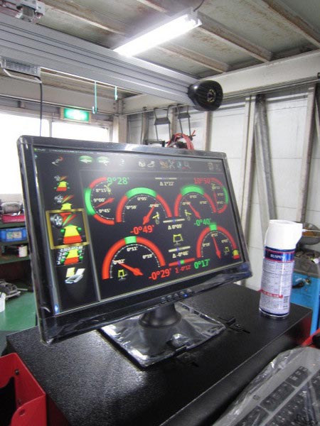 早速アライメント調整を開始しますと・・・ やはり全体的にタイヤが左方向へ向いていました。