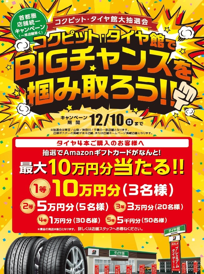 タイヤ館でBIGチャンスを掴み取ろう!! ポスト 2023年10月31日 12月10日(日)まで 「BIGチャンスを掴み取ろう!!」キャンペーンを開催中です。 当店でブリヂストンのタイヤを4本お買い求めのお客様には抽選で「amazonギフトカード」が当たるキャンペーンを実施中です。 1等はなんと「10万円分」!! お会計後、応募用紙をお渡しいたしますのでご記入いただきご応募ください。 この機会にぜひ当店をご利用いただければと思います。 ご来店お待ちしております。 カテゴリ:お知らせ