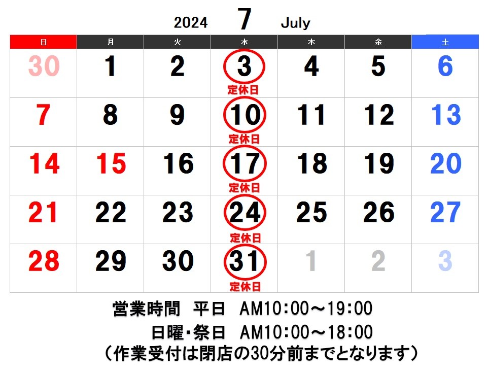 7月の定休日のご案内 ポスト 2024年6月30日 7月のお休みは 3日(水) 10日(水) 17日(水) 24日(水) 31日(水)です。 営業時間は 平日 10:00~19:00 (受け付けは閉店30分前18:30まで) 日・祝 10:00~18:00(受け付けは閉店30分前17:30まで) 7月もお客様のご来店をスタッフ一同お待ちしております。 カテゴリ:お知らせ