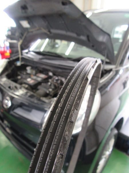 部品を取り寄せ作業を開始しました。ファンベルトを外してみますと、ファンベルトの一部がなくなっていました。発見がもう少し遅かったらファンベルトが切れていたかもしれません。