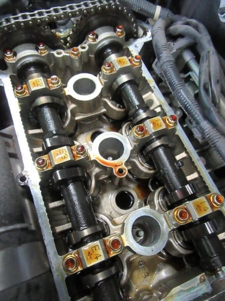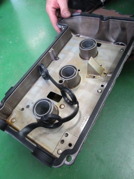 次にオイル漏れの修理です。ロッカーカバー(エンジンの上部)を外してゴムパッキンを触ってみると、プラスチックのように硬くなっていました。