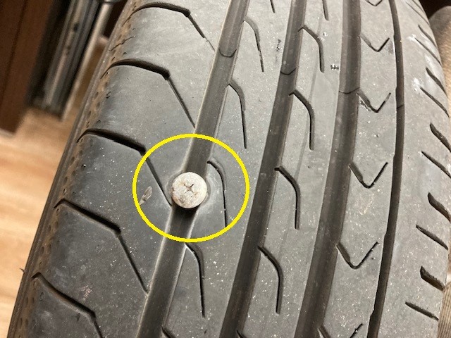 本日、ご来店いただきましたお客様のお車を拝見すると見事にビスが刺さっていましたが
