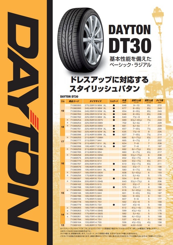 国内で販売されているデイトンタイヤは「DT30」の一種類です。
