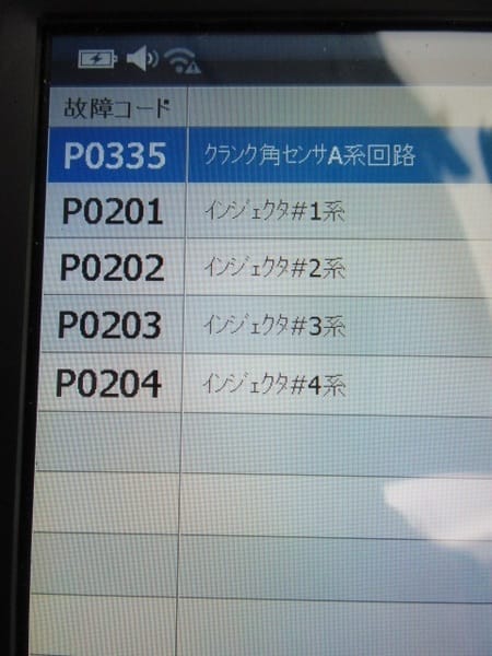 念のためスキャンツールで診断してみると、クランク角センサ回路異常なので、エンストしてしまう原因はクランク角センサーで間違いなさそうです。