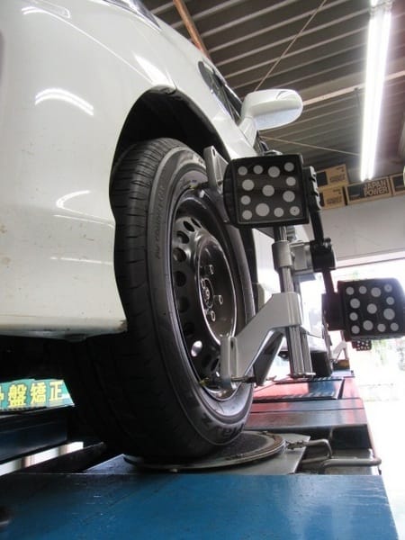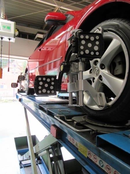 現在アライメントテスターは「タイヤ専門店」や「大きな鈑金修理工場」、各メーカーの「テクニカル工場」にしか完備されていないのが現状だと思います。(違ったらすみません)