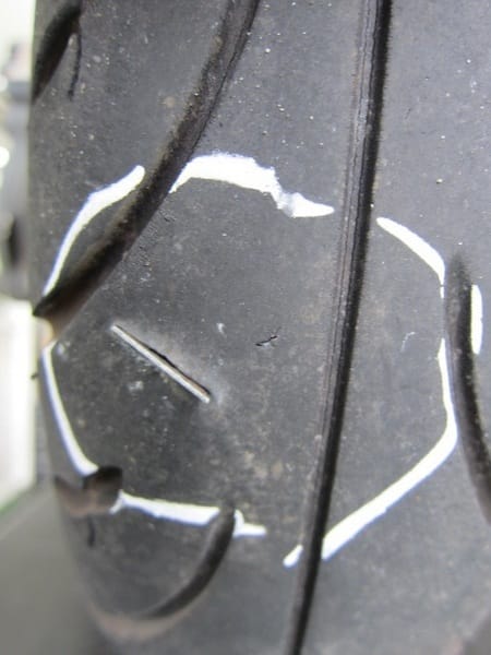 早速、懐かしいミントのタイヤの点検をしましたら、カッターの刃がタイヤに突き刺さっているではありませんか!これでは修理は無理な為お客様にご連絡。納得していただいて交換となりました。しかし最近の原チャリはチューブレス(チューブが無)な為、簡単ですが、