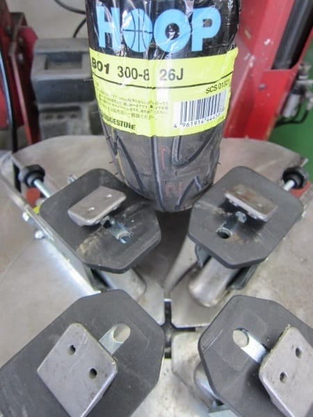 写真4枚目をご参考!!乗用車・トラック用のタイヤチェンジャーで対応できるバイク・スクーター専用アダプターをご用意していますので小さいサイズでも大丈夫です。一度スタッフに聞いて見て下さい。ご来店お待ちしています。