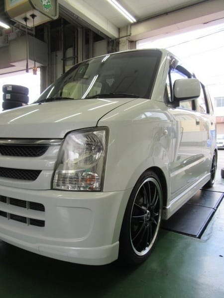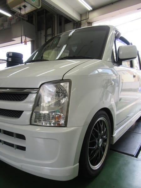 ワゴンRのお客様です。先月、車高調、マフラー、15インチのアルミホイールとタイヤセットをお買い上げいただきました。この技術サービス情報でもご紹介をさせていただいております。