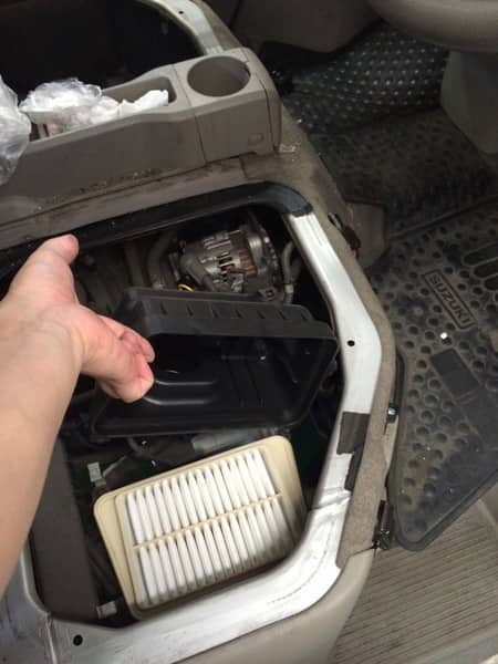 エブリーワゴンはエンジンが運転席と助手席の下にありますので、エアフィルターの交換は運転席の椅子を跳ね上げて行います。容易には見られない場所にあるため、ついつい交換をおろそかにしてしまう傾向があるようです。