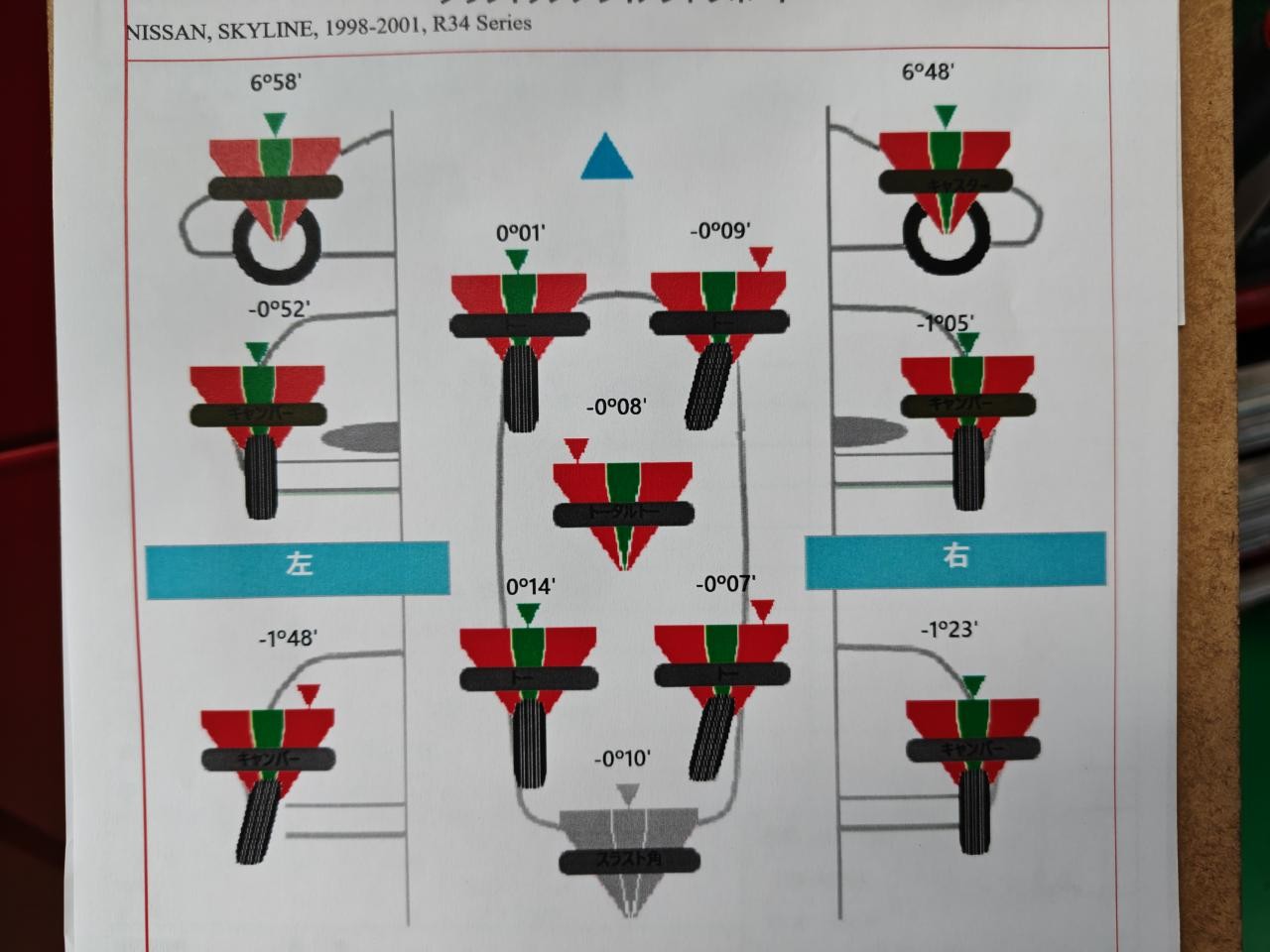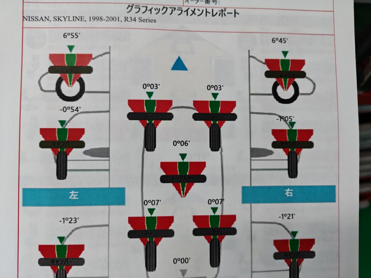 調整が出来る所では右フロントのトーと右リアのトーが基準値からズレてますね。