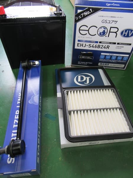 作業内容は、エンジンオイル、エレメント、エアエレメント、スタビリンク、ブレーキフルード、補機バッテリーです。