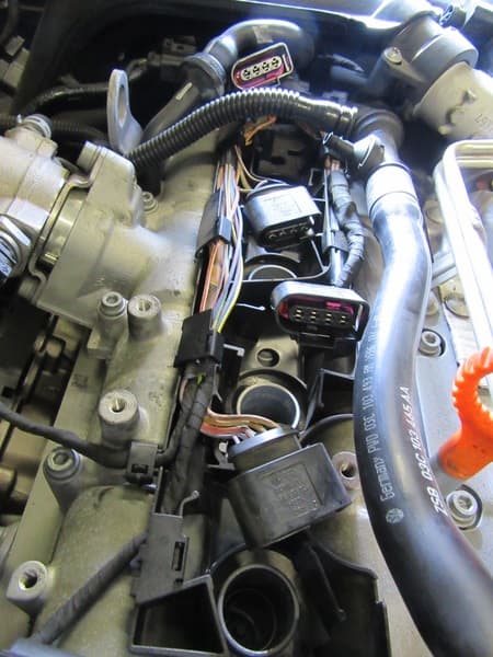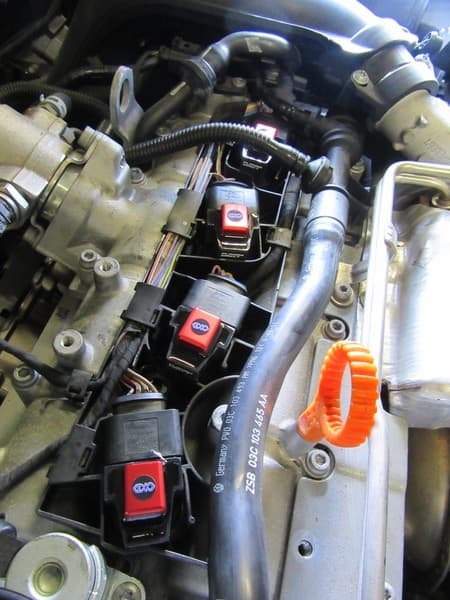 今回のアウディA1もエンジン上部のカバーと周辺のホースを外して交換作業を行いました。