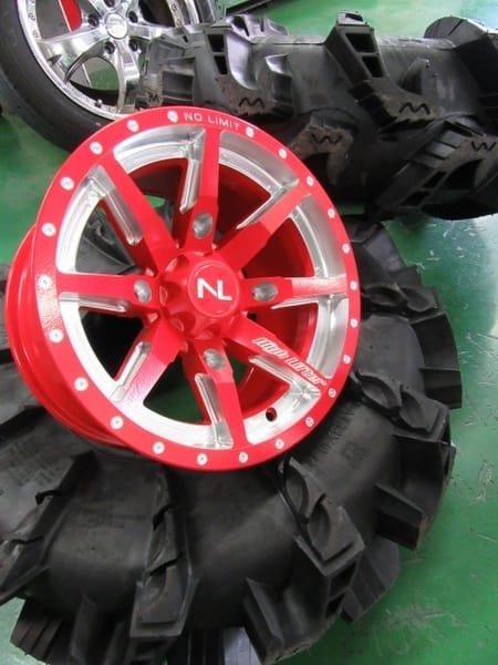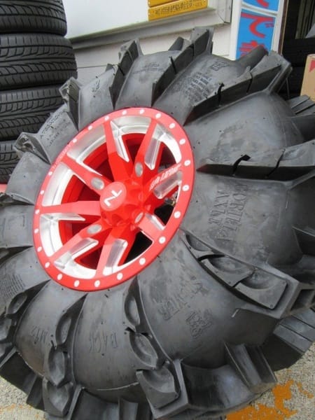 今回は赤いおしゃれなホイールとワイルドなタイヤをセットします。