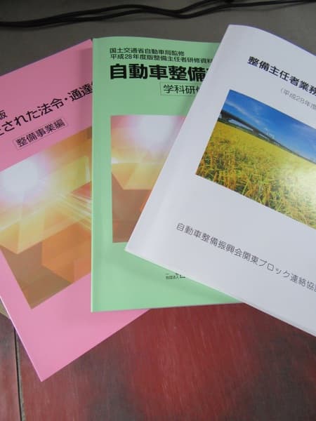 テキストは3冊あり、最近改正された法令、自動車整備新技術、整備主任者業務の事についてでした。