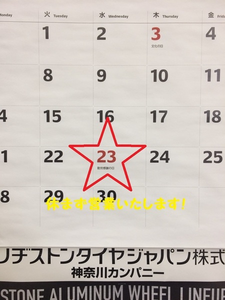 水曜定休日のタイヤ館瀬谷ですが、今週は水曜日が祝日のため休まず営業いたします。