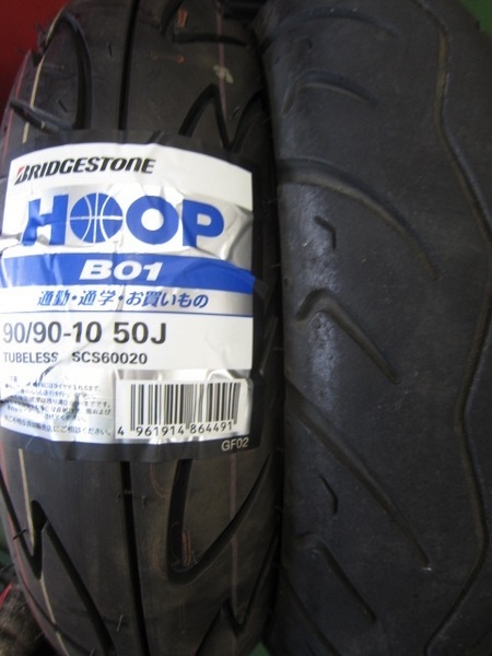 今回の装着タイヤは、ブリヂストンタイヤ HOOP(フープ)B01 90/90-10です。