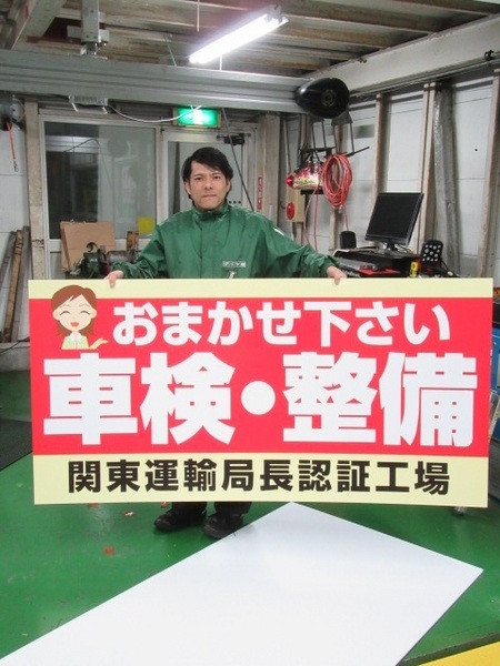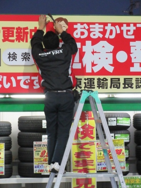 先月末に当店厚木街道側のタイヤを展示しているシャラック上部の看板設置工事を行いました。