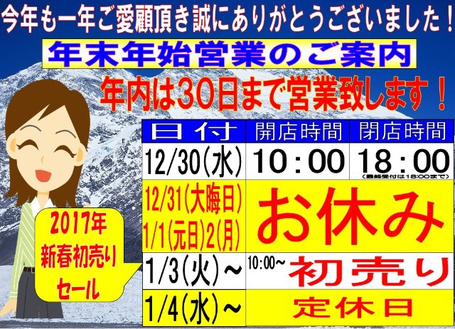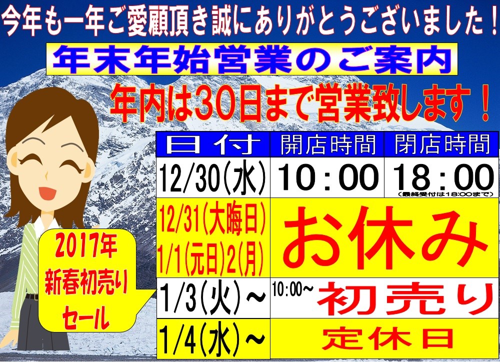 年末年始の営業時間のご案内 ポスト 2016年12月24日 タイヤ館瀬谷 年末年始の営業時間のご案内です。2016年は12月30日(金)まで営業させていただきます。最終日の営業時間は AM 10:00~ PM 18:00 (最終受付18:00)までとなります。 12月30日(大晦日)~新年1月2日(月)まではお休みとさせていただきますのでご注意ください。新年は1月3日(火)より「初売りセール」で営業開始となります。また、翌1月4日(水)は定休日とさせていただきます。お間違えの無いようよろしくお願いいたします。 カテゴリ:お知らせ