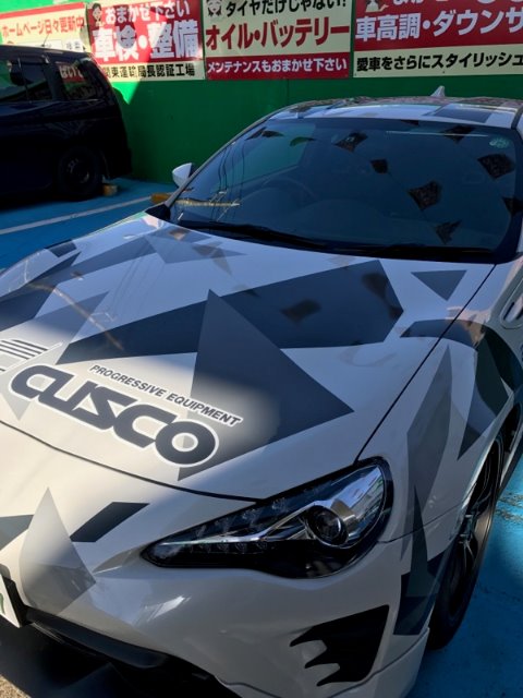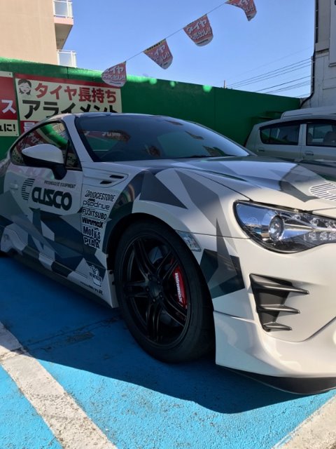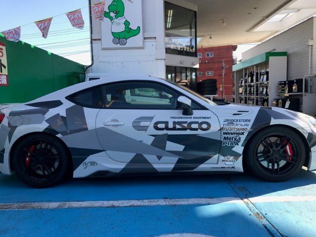 先日ですが、足回りパーツの大手メーカー「CUSCO」の営業マンの方が何やら派手な車で当店に現れました。