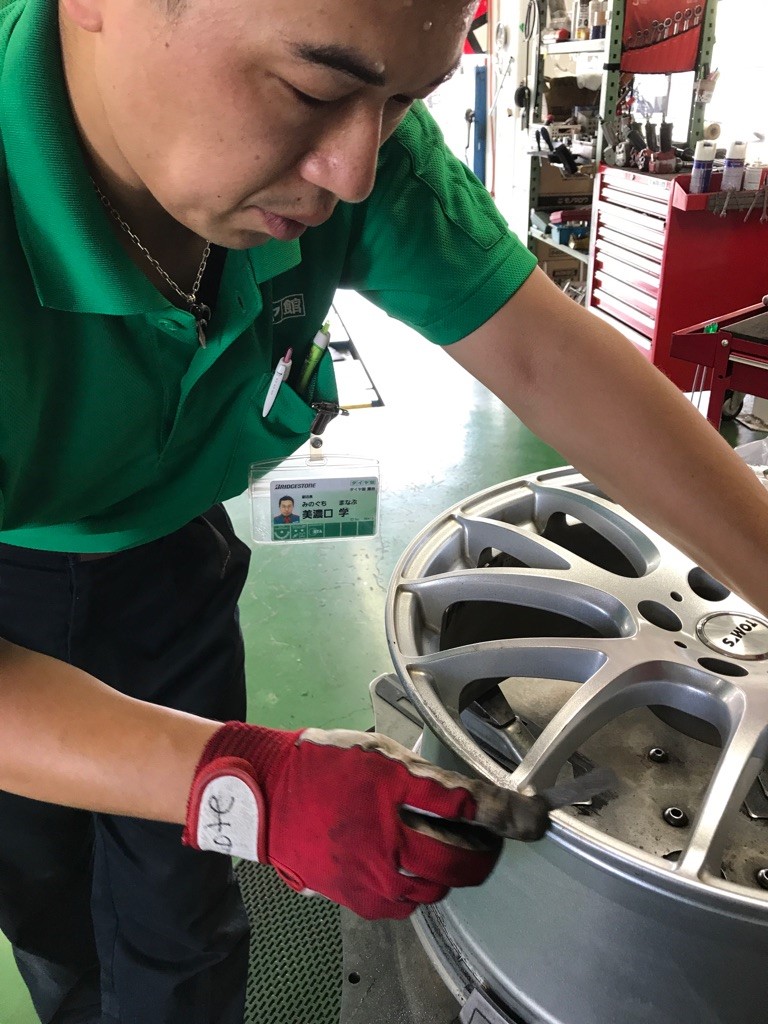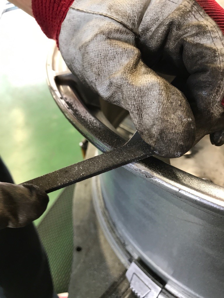 今回もお電話でお問い合わせいただいたお客様のホイール修理を美濃口スタッフが真剣に行っていました。
