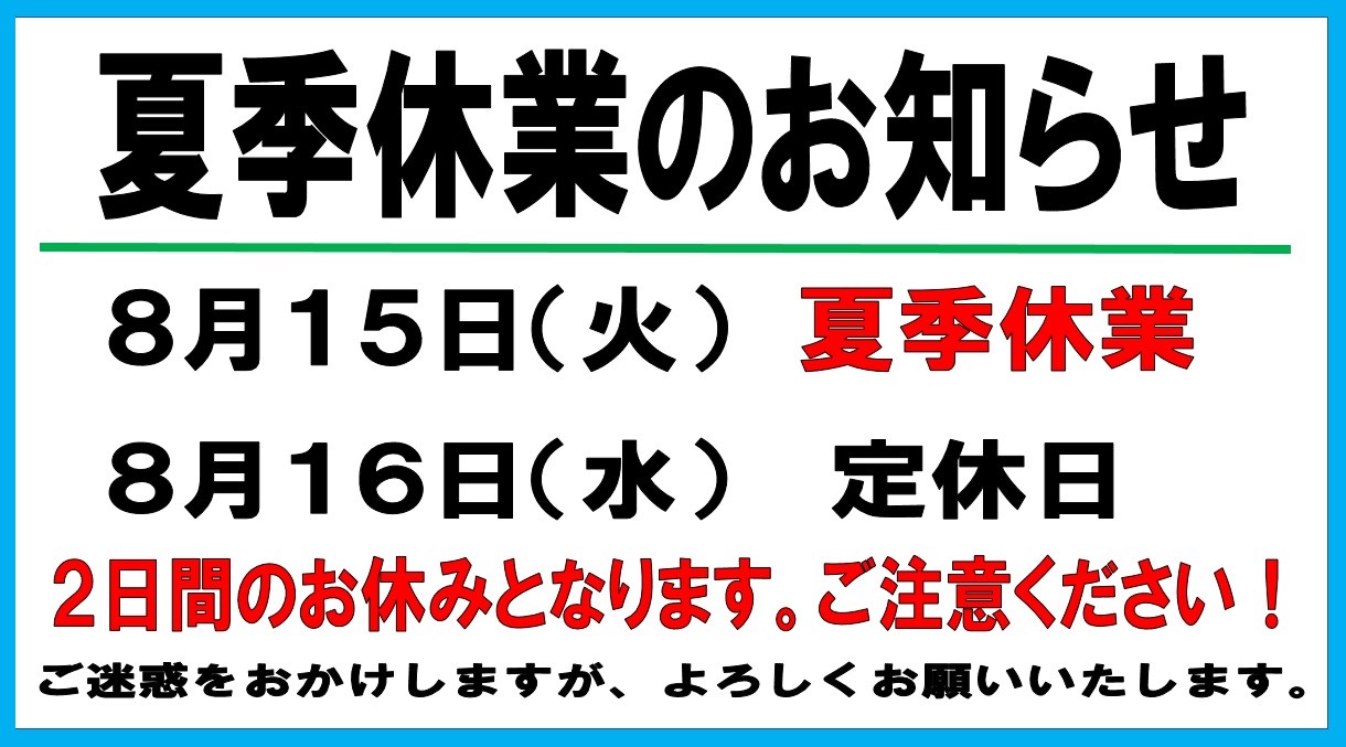 夏季休業のお知らせ ポスト 2017年8月14日 8月15日(火)は『夏季休業』とさせていただきます。 16日(水)は定休日となりますので、2日間のお休みとなります。 ご迷惑をおかけいたしますが、何卒ご了承くださいませ。 カテゴリ:お知らせ