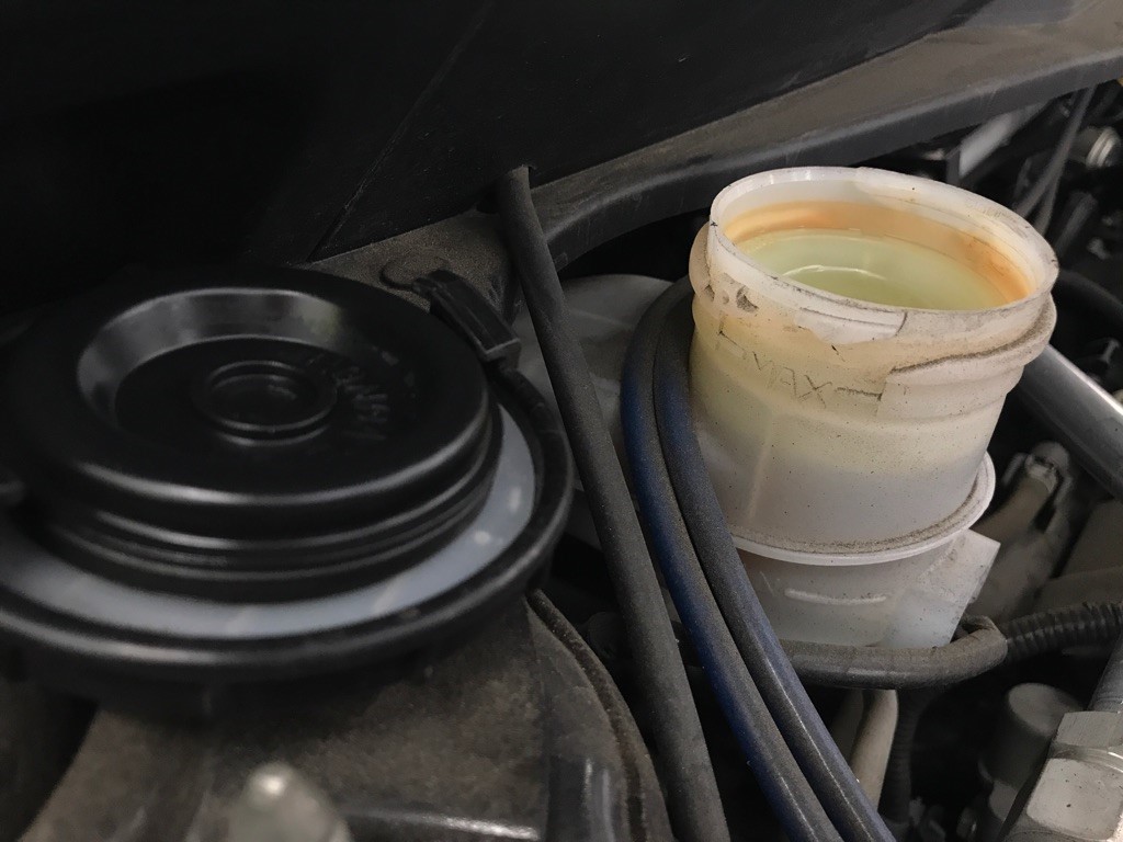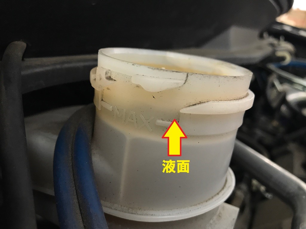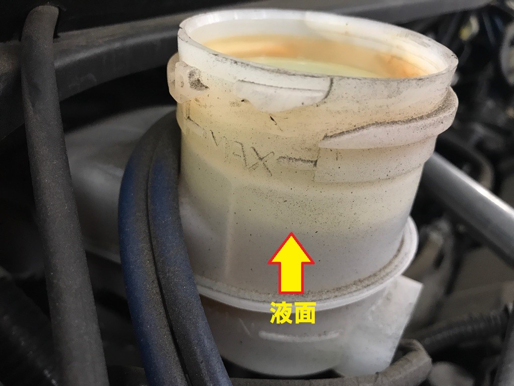 ブレーキオイルがなくならないようにオイルを貯めておくタンクですが、ブレーキパッドが摩耗して減ってくると、ピストンの飛び出す距離が大きくなるので、リザーバタンク内のオイルの量が少しだけ減ります。