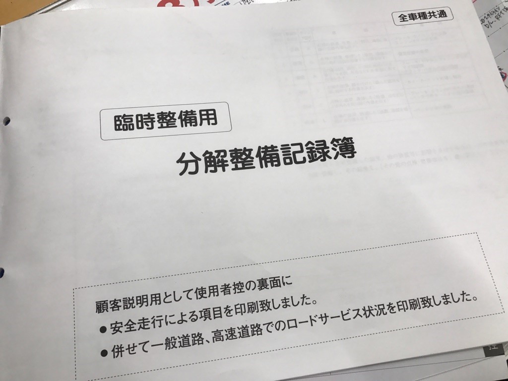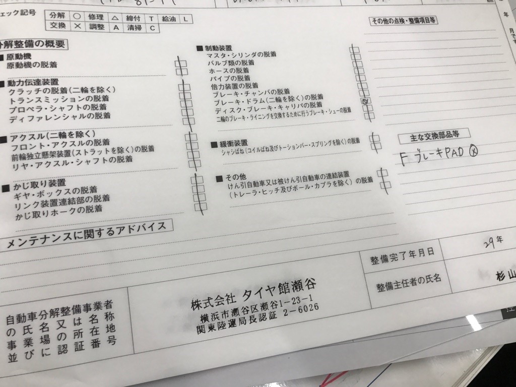 これは「自動車分解整備事業者」が車検などの法定点検以外に分解整備(ブレーキパッド交換の他にも色々あります)を行った場合に記入して車の所有者にお渡しするものです。