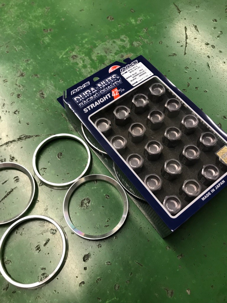 取付時に「ハブリング」とRAYSの「ジュラルミンロック&ナットセット」を使用しました。