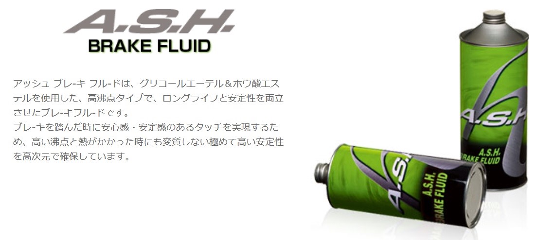 アッシュ ブレ-キ フル-ドは、グリコールエーテル&ホウ酸エステルを使用した、高沸点タイプで、ロングライフと安定性を両立させたブレ-キフル-ドです。