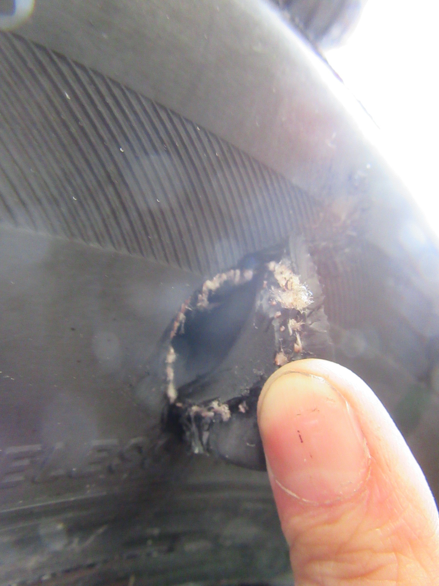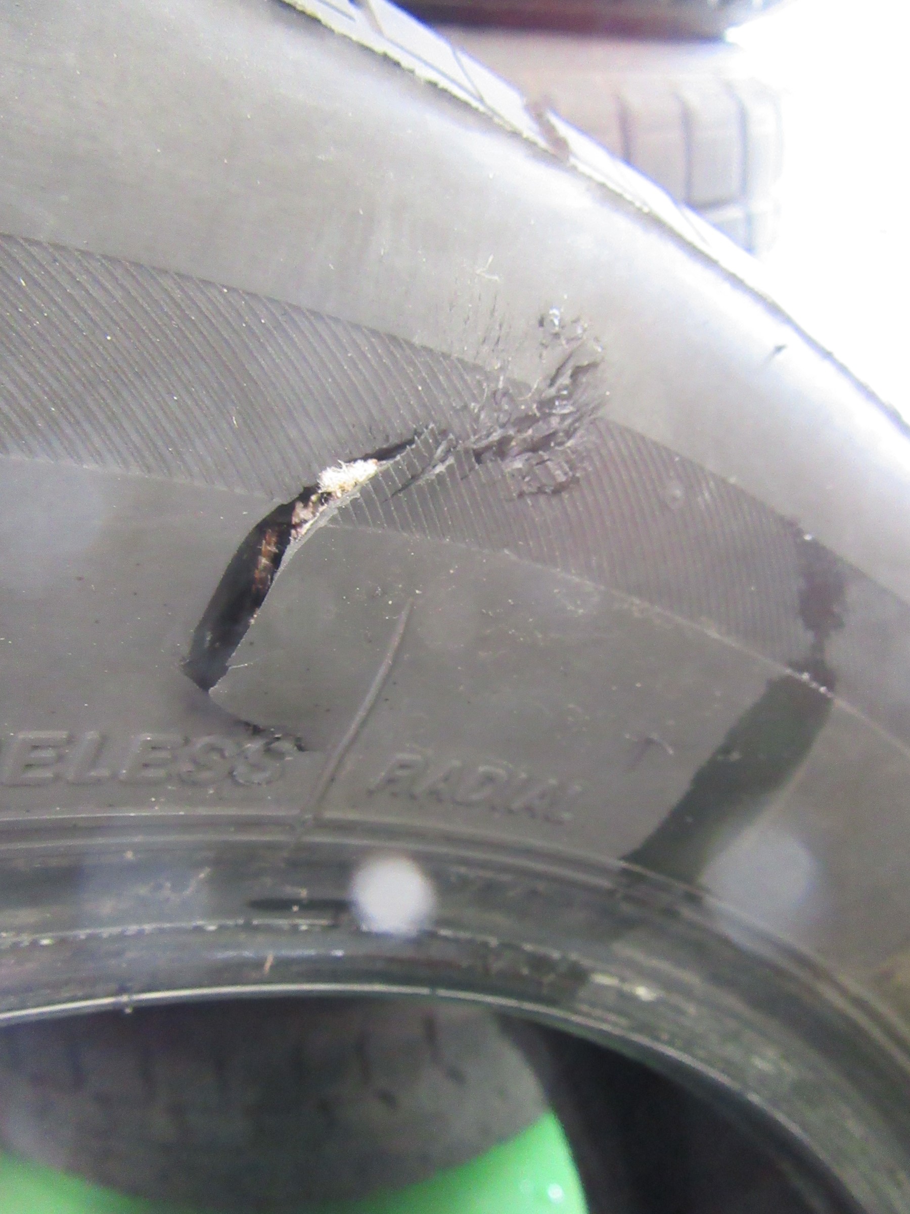タイヤのサイドの部分をぶつけてしまい横に穴が開いてしまい交換してほしいとのご来店です。