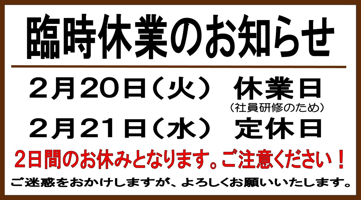 臨時休業のおしらせ ポスト 2018年2月1日 2月20(火)は社員研修の為『臨時休業』とさせていただきます。 お客様にはご迷惑をおかけいたしますが何卒ご理解のほどよろしくお願いいたします。 また、翌21日(水)は定休日となり、二日間のお休みとなります。 お間違えの無いようご注意ください。 カテゴリ:お知らせ