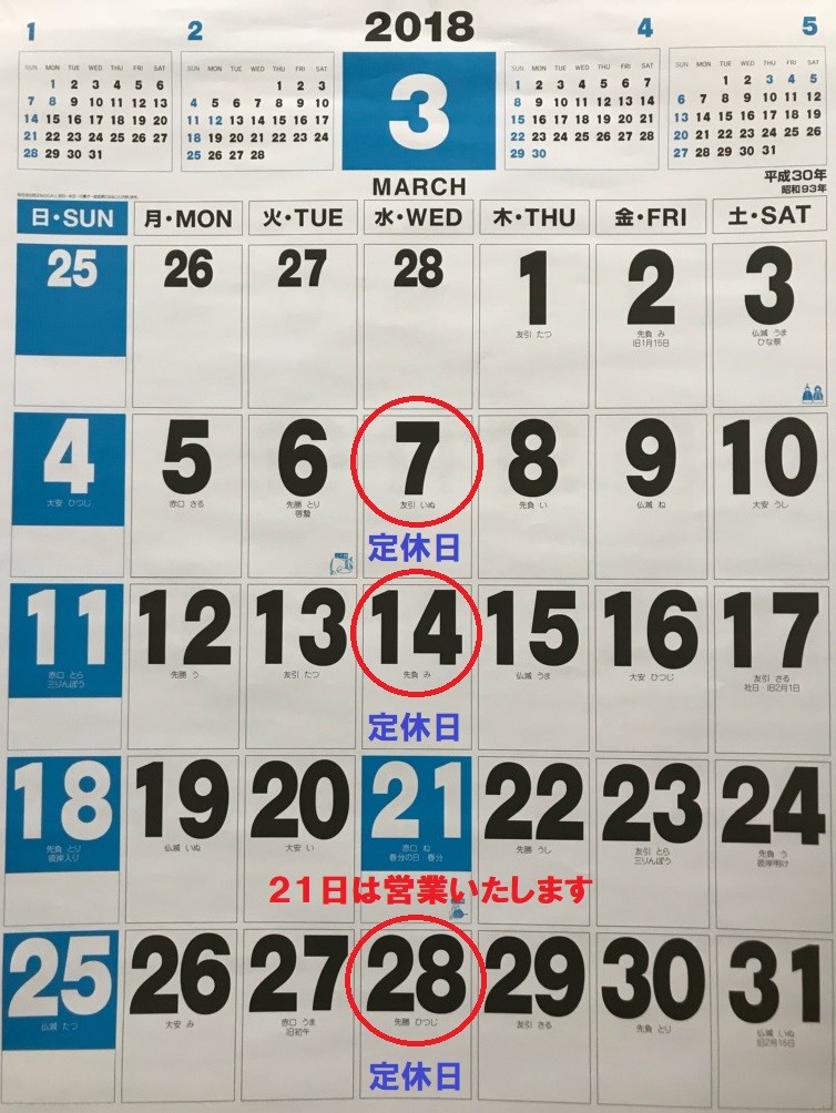 3月の定休日のご案内です ポスト 2018年3月1日 3月お休みは 7日(水) 14日(水) 28日(水) です。 21日(祝)は休まず営業いたします。 3月1日(火)~3月21日(祝)まで『ブリヂストンアルミホイールキャンペーン』を開催いたします。 当店お勧めの「ブリヂストンアルミホイール」をお得に購入できるチャンスです! ぜひご利用くださませ。 3月もスタッフ一同お客様のご来店をお待ちしております。 カテゴリ:お知らせ