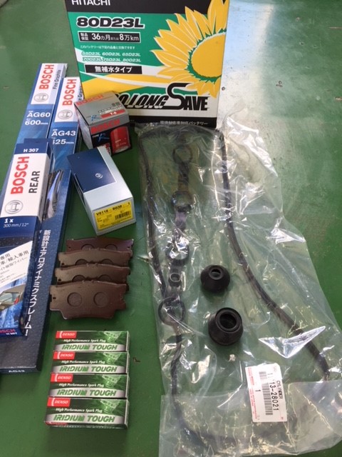 交換した部品は、フロントブレーキパッド、ロッカーカバーパッキン、タイロッドエンドブーツ、ロアボールジョイントブーツ、スパークプラグ、ワイパーブレード、バッテリー、エンジンオイル、ブレーキフルードです。