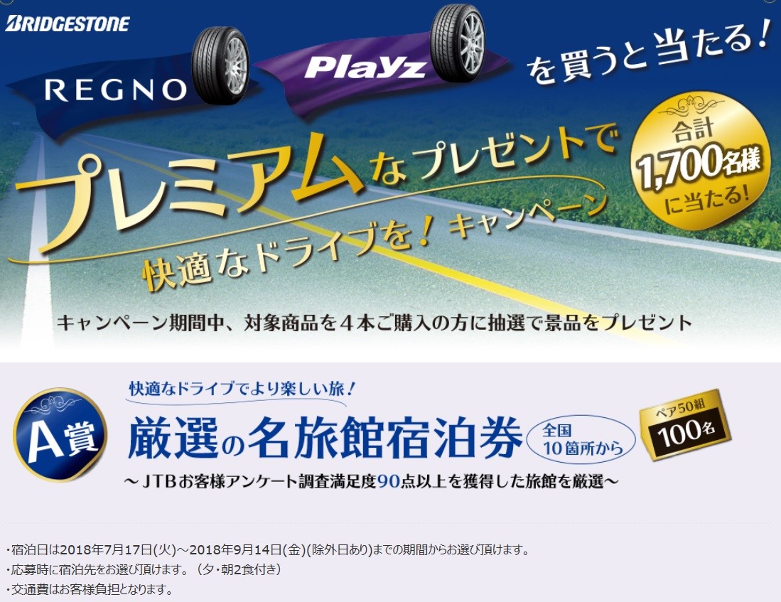 期間中ブリヂストンのプレミアムタイヤ「レグノGR-XI」「レグノGRVⅡ」「レグノGR-レジェーラ」「プレイズPX」「プレイズPX-RV」「プレイズPX-C」のいずれかを4本セットでお買い求めいただいたお客様には抽選でプレミアムな商品が当たります。