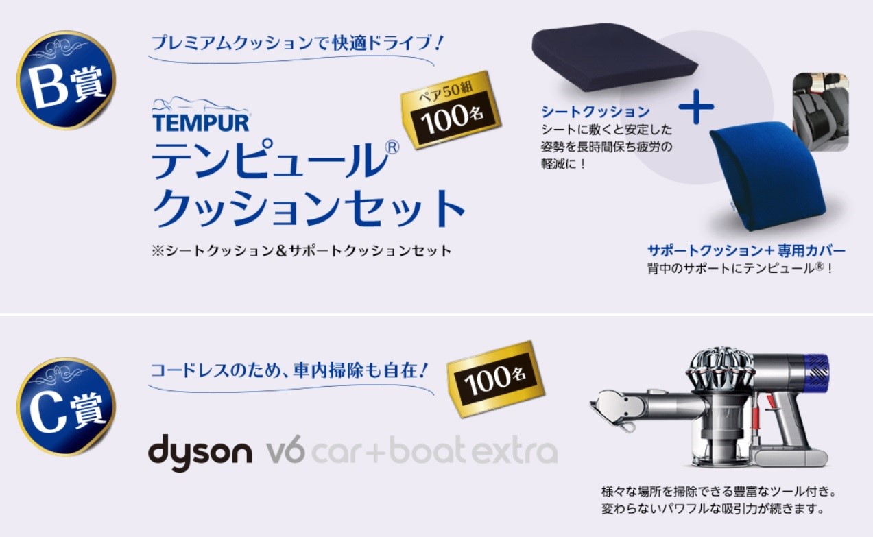 B賞は「プレミアムクッションで快適ドライブ!」ということで「テンピュールクッションセット」を100名様に!