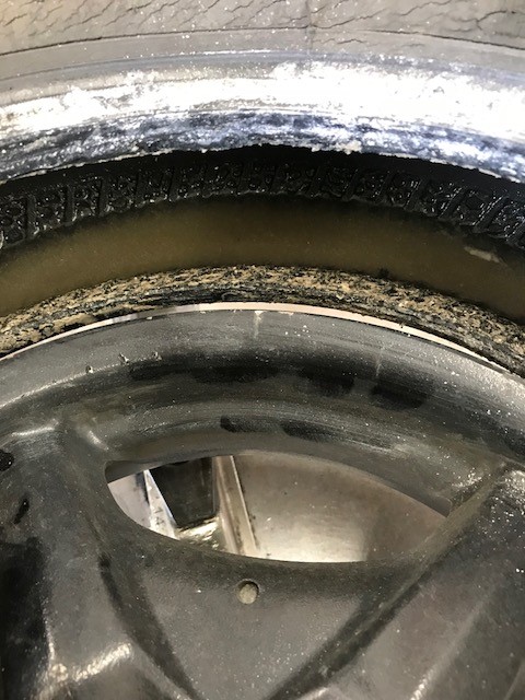 古いタイヤを外しましたら、タイヤの中に大量の水が入っていて
