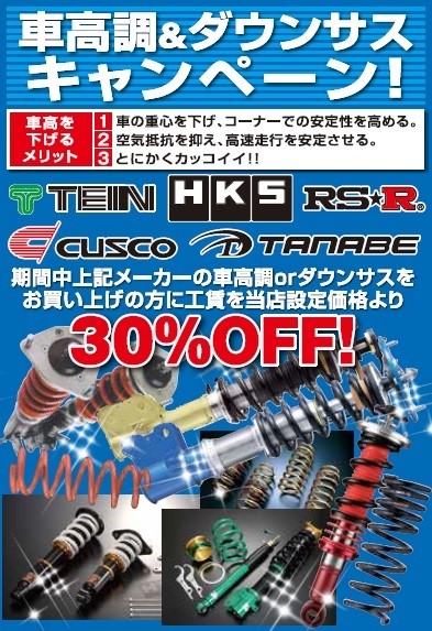 足回りキャンペーン 開催!! ポスト 2018年9月22日 毎回好評をいただいております「足回りキャンペーン」を開催いたします。 期間は9月22日(土)から10月21日まで!! 期間中、当店で通常販売させていただいている車高調&ダウンサスをお買い上げのお客様には、取付け工賃を当店既定の料金より30%OFFさせていただきます。 (取付け工賃は車種、取付け商品によって異なります) この機会にぜひどうぞ! カテゴリ:お知らせ