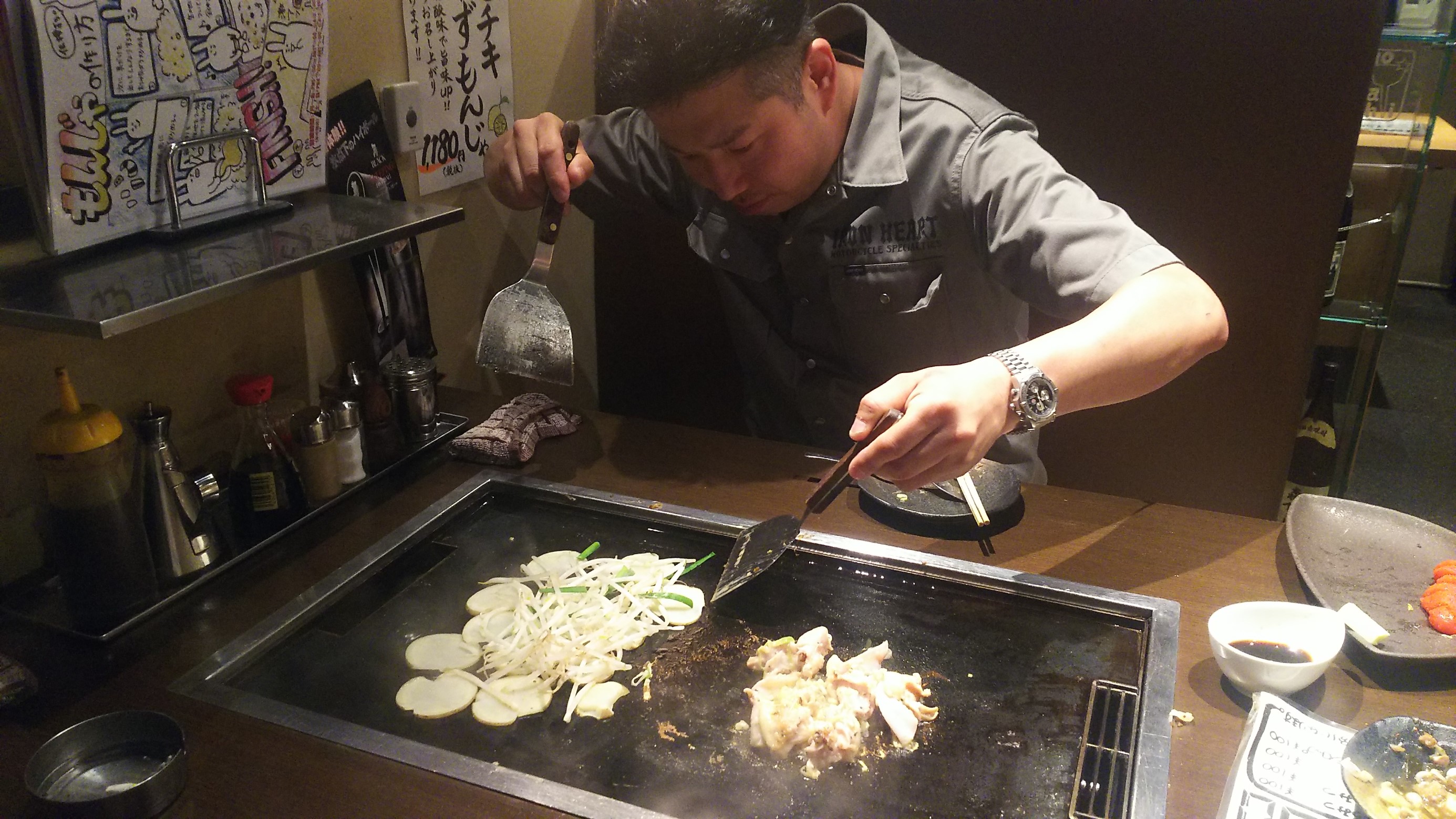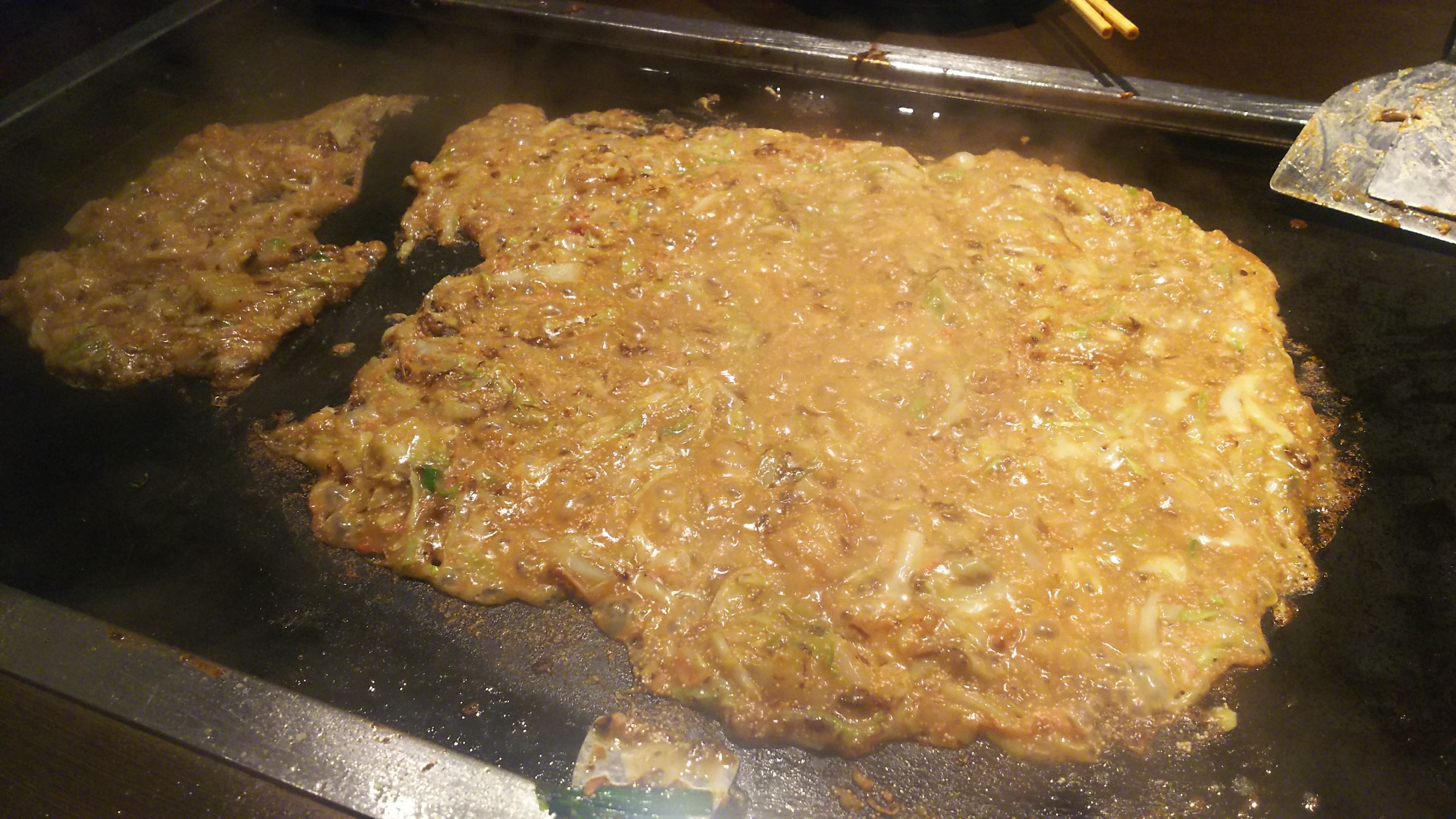 もんじゃ焼きを焼いていたところでこの日はワールドカップで日本代表の試合があり2点目を入れていました(*´ω`*)