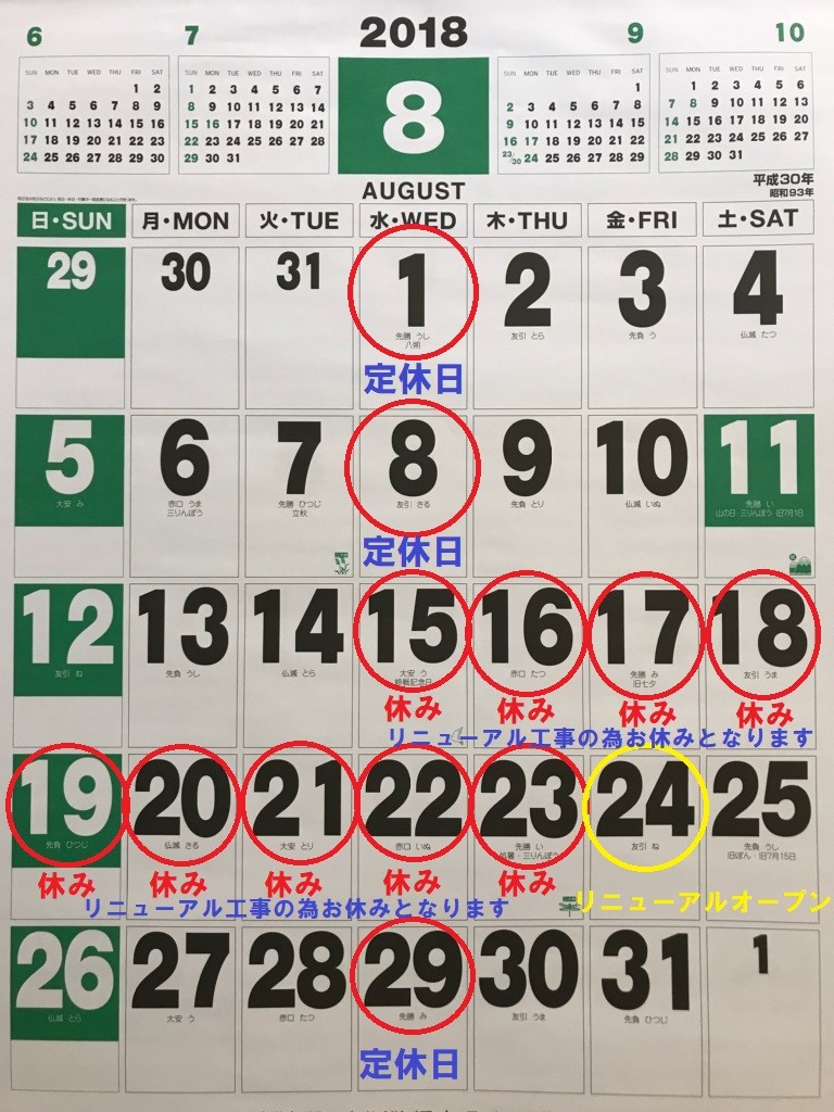 8月の定休日と臨時休業のご案内です ポスト 2018年8月1日 8月お休みは 1日(水) 8日(水) 15日(水) 16日(木) 17日(金) 18日(土) 19日(日) 20日(月) 21日(火) 22日(水) 23日(木) 29日(水) です。 8月15日(水)~8月23日(木)の期間中はリニューアル工事の為「臨時休業」とさせていただきます。 営業時間は 平日 10:00~19:00 (受け付けは閉店30分前18:30まで) 日曜・祝日 10:00~18:00 (受け付けは閉店30分前17:30まで) 8月もお客様のご来店をスタッフ一同お待ちしております。 カテゴリ:お知らせ