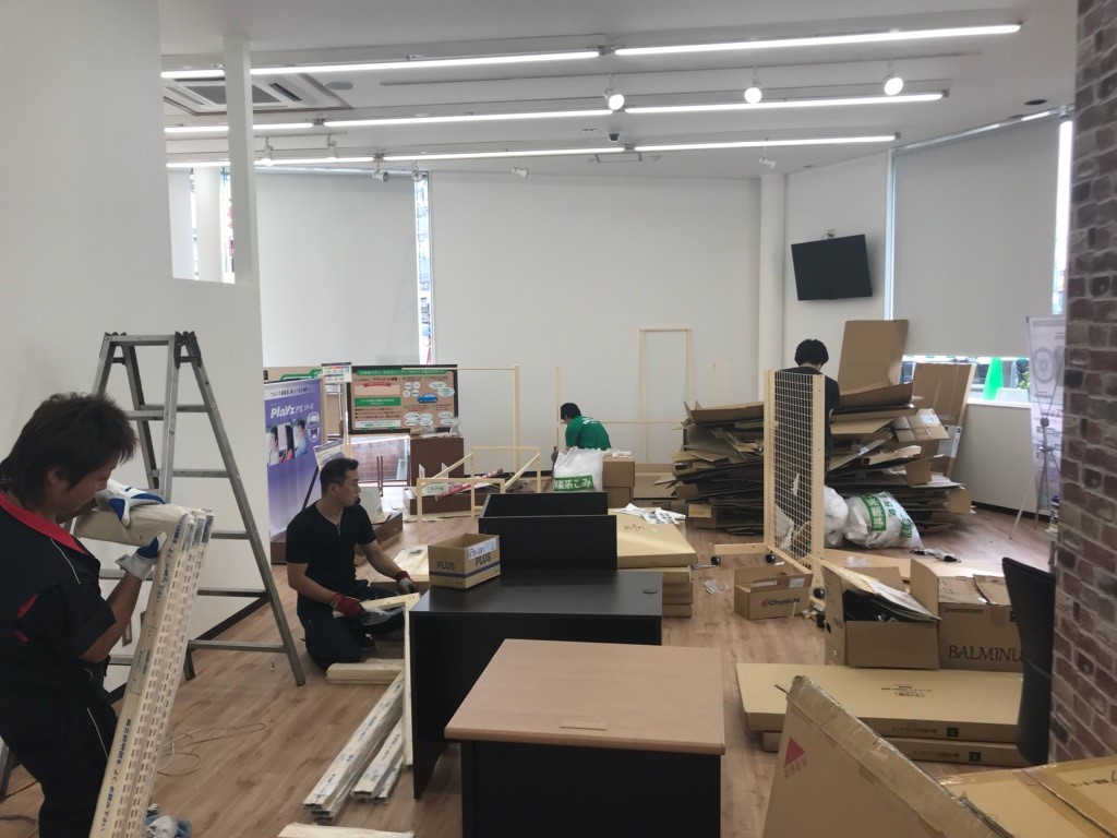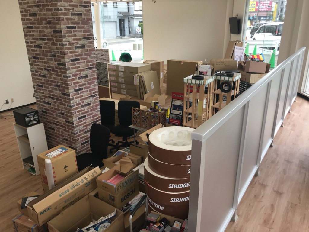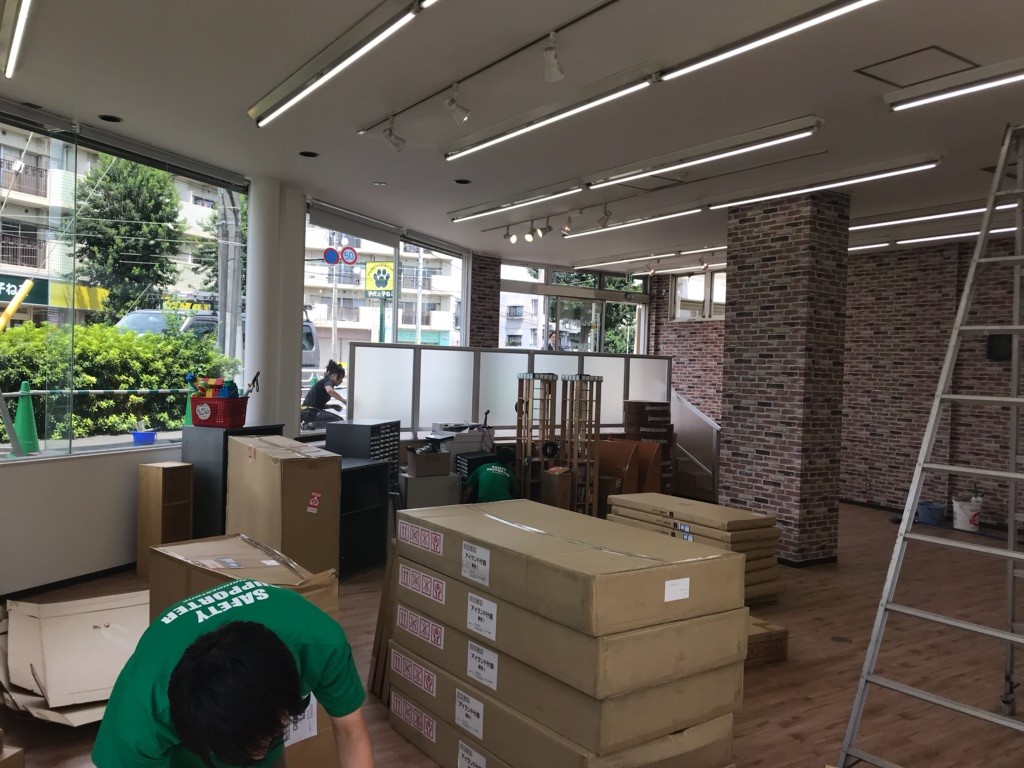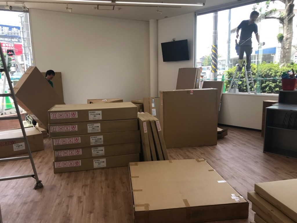 まずはガランとした店内に大量の展示什器&荷物を運び入れていきます。